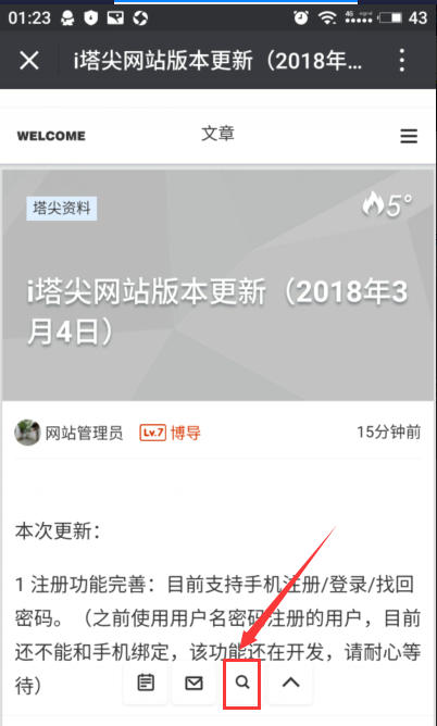 4 新增网站搜索功能。旧版本PC端支持搜索,现版本在手机端同样支持搜索。在手机端每个页面,都有悬浮图标,点击搜索即可,如下图所示